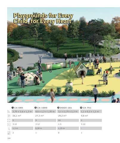 1141232,75 x 2,6 x 1,3 m 4,6 x 1,3 x 1,35 m 3,1 x 2,75 x 2,3 m 1,1 x 0,2 x 1,2 m26,1 m%u00b2 27,3 m%u00b2 29,2 m%u00b2 9,8 m%u00b23 3 14 23-12 3-12 1-5 3-1211,3 m21,25 m80,20 m1-1 CA 680 2 CA 1000 3 DGGS 101 4 CA 751Playgrounds for Every Child, for Every Heart Playgrounds for Every Child, for Every Heart