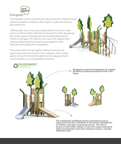124The Evergreen Series combines the natural warmth of Robinia wood with the durability of metal to offer children a safe and inspiring play experience. Offering safe, low-to-the-ground play stations for the 2-5 age group, as well as higher, adventurous designs for older age groups, this series supports the physical and social development of children of all ages. HPL figures sit on top of the support legs, making children feel the enchanting atmosphere of the forest and stimulating their imagination. This series, which brings together different textures and game values with the colourful HPL materials used in panel games, brings the forest atmosphere to the playground and invites children to an unforgettable adventure.EvergreenDesigned to enrich the imagination by creating the feeling of playing among the trees in the forest.The combination of different texture components such as wood, metal and HPL contributes to the sensory development of children, especially in young age groups. The natural texture of wood offers children a warm and unique experience, while its combination with other materials creates a versatile exploration area.ENVIRONMENTFRIENDLY