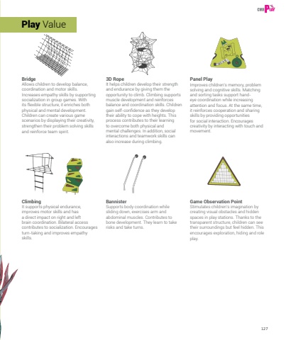 127BridgeAllows children to develop balance, coordination and motor skills. Increases empathy skills by supporting socialization in group games. With its flexible structure, it enriches both physical and mental development. Children can create various game scenarios by displaying their creativity, strengthen their problem solving skills and reinforce team spirit.Play ValuePanel PlayImproves children%u2019s memory, problem solving and cognitive skills. Matching and sorting tasks support handeye coordination while increasing attention and focus. At the same time, it reinforces cooperation and sharing skills by providing opportunities for social interaction. Encourages creativity by interacting with touch and movement. Game Observation PointStimulates children%u2019s imagination by creating visual obstacles and hidden spaces in play stations. Thanks to the transparent structure, children can see their surroundings but feel hidden. This encourages exploration, hiding and role play. BannisterSupports body coordination while sliding down, exercises arm and abdominal muscles. Contributes to bone development. They learn to take risks and take turns.ClimbingIt supports physical endurance, improves motor skills and has a direct impact on right and left brain coordination. Bilateral access contributes to socialization. Encourages turn-taking and improves empathy skills. 3D RopeIt helps children develop their strength and endurance by giving them the opportunity to climb. Climbing supports muscle development and reinforces balance and coordination skills. Children gain self-confidence as they develop their ability to cope with heights. This process contributes to their learning to overcome both physical and mental challenges. In addition, social interactions and teamwork skills can also increase during climbing.