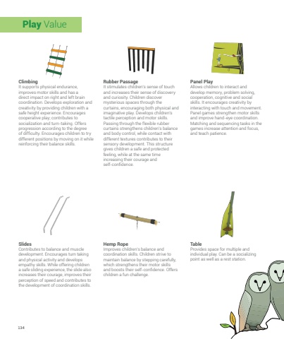 134Panel PlayAllows children to interact and develop memory, problem solving, cooperation, cognitive and social skills. It encourages creativity by interacting with touch and movement. Panel games strengthen motor skills and improve hand-eye coordination. Matching and sequencing tasks in the games increase attention and focus, and teach patience. Play ValueClimbingIt supports physical endurance, improves motor skills and has a direct impact on right and left brain coordination. Develops exploration and creativity by providing children with a safe height experience. Encourages cooperative play; contributes to socialization and turn-taking. Offers progression according to the degree of difficulty. Encourages children to try different positions by moving on it while reinforcing their balance skills. Rubber PassageIt stimulates children%u2019s sense of touch and increases their sense of discovery and curiosity. Children discover mysterious spaces through the curtains, encouraging both physical and imaginative play. Develops children%u2019s tactile perception and motor skills. Passing through the flexible rubber curtains strengthens children%u2019s balance and body control, while contact with different textures contributes to their sensory development. This structure gives children a safe and protected feeling, while at the same time increasing their courage and self-confidence. SlidesContributes to balance and muscle development. Encourages turn taking and physical activity and develops empathy skills. While offering children a safe sliding experience, the slide also increases their courage, improves their perception of speed and contributes to the development of coordination skills.Hemp RopeImproves children%u2019s balance and coordination skills. Children strive to maintain balance by stepping carefully, which strengthens their motor skills and boosts their self-confidence. Offers children a fun challenge.TableProvides space for multiple and individual play. Can be a socializing point as well as a rest station.
