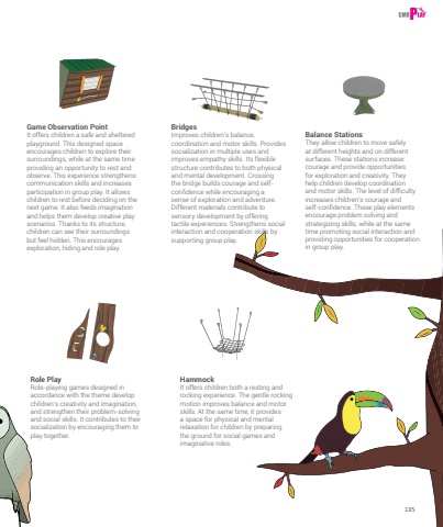 135Game Observation PointIt offers children a safe and sheltered playground. This designed space encourages children to explore their surroundings, while at the same time providing an opportunity to rest and observe. This experience strengthens communication skills and increases participation in group play. It allows children to rest before deciding on the next game. It also feeds imagination and helps them develop creative play scenarios. Thanks to its structure, children can see their surroundings but feel hidden. This encourages exploration, hiding and role play. Balance StationsThey allow children to move safely at different heights and on different surfaces. These stations increase courage and provide opportunities for exploration and creativity. They help children develop coordination and motor skills. The level of difficulty increases children%u2019s courage and self-confidence. These play elements encourage problem solving and strategizing skills, while at the same time promoting social interaction and providing opportunities for cooperation in group play.Hammock It offers children both a resting and rocking experience. The gentle rocking motion improves balance and motor skills. At the same time, it provides a space for physical and mental relaxation for children by preparing the ground for social games and imaginative roles.Role PlayRole-playing games designed in accordance with the theme develop children%u2019s creativity and imagination, and strengthen their problem-solving and social skills. It contributes to their socialization by encouraging them to play together. BridgesImproves children%u2019s balance, coordination and motor skills. Provides socialization in multiple uses and improves empathy skills. Its flexible structure contributes to both physical and mental development. Crossing the bridge builds courage and selfconfidence while encouraging a sense of exploration and adventure. Different materials contribute to sensory development by offering tactile experiences. Strengthens social interaction and cooperation skills by supporting group play.
