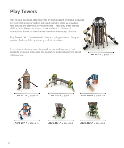 14Play Towers designed specifically for children support children%u2019s language development, communication skills and cognitive skills by providing role-playing and dramatic play experiences. These play areas provide children with the opportunity to model and enrich daily social interactions thanks to their themes based on the concept of home. Play Towers help children develop their empathy, problem-solving and creative thinking skills by imitating real-life situations. In addition, such environments provide a safe and fun space that supports children%u2019s processes of establishing and strengthening social relationships.CDP 101-P / page 59 CDP 105-P / page 77 AGFS 210-P / page 245AGFS 207-P / page 246 AGFS 251-P / page 252 AGFS 253-P / page 258Play TowersCDP 103-P / page 71