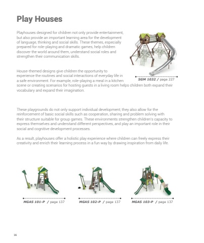 16Playhouses designed for children not only provide entertainment, but also provide an important learning area for the development of language, thinking and social skills. These themes, especially prepared for role-playing and dramatic games, help children discover the world around them, understand social roles and strengthen their communication skills.House-themed designs give children the opportunity to experience the routines and social interactions of everyday life in a safe environment. For example, role-playing a meal in a kitchen scene or creating scenarios for hosting guests in a living room helps children both expand their vocabulary and expand their imagination.These playgrounds do not only support individual development; they also allow for the reinforcement of basic social skills such as cooperation, sharing and problem solving with their structure suitable for group games. These environments strengthen children%u2019s capacity to express themselves and understand different perspectives, and play an important role in their social and cognitive development processes.As a result, playhouses offer a holistic play experience where children can freely express their creativity and enrich their learning process in a fun way by drawing inspiration from daily life.MGAS 101-P / page 137 MGAS 102-P / page 137 MGAS 103-P / page 137Play HousesSGM 1032 / page 227