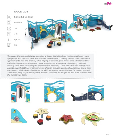 1715,15 x 5,0 x1,95 m44,0 m%u00b2 161-50,6 m16DGCS 201The ocean-themed habitat play group has a design that stimulates the imagination of young age groups and supports their multi-faceted development. Crawling tunnels offer children the opportunity to hide and explore, while helping to develop gross motor skills. Rubber curtains and colorful polycarbonate panels create a mysterious atmosphere, developing children%u2019s sensory skills while increasing the excitement of discovery. Table and table-less resting areas provide a comfortable environment where children can calm down and socialize or create their own games. While developing fine motor skills with panel games that can be rotated, pushed and turned, they play balance games with sea creatures on the ground and learn to count with the numbers on them.