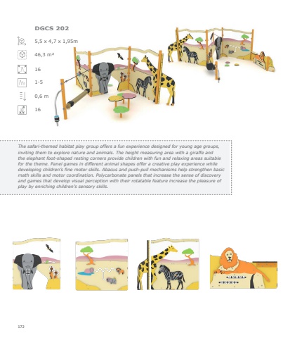 1725,5 x 4,7 x 1,95m46,3 m%u00b2 161-50,6 m16DGCS 202The safari-themed habitat play group offers a fun experience designed for young age groups, inviting them to explore nature and animals. The height measuring area with a giraffe and the elephant foot-shaped resting corners provide children with fun and relaxing areas suitable for the theme. Panel games in different animal shapes offer a creative play experience while developing children%u2019s fine motor skills. Abacus and push-pull mechanisms help strengthen basic math skills and motor coordination. Polycarbonate panels that increase the sense of discovery and games that develop visual perception with their rotatable feature increase the pleasure of play by enriching children%u2019s sensory skills.