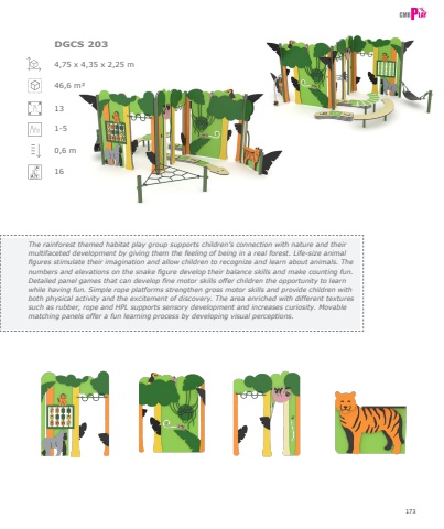 1734,75 x 4,35 x 2,25 m46,6 m%u00b2 131-50,6 m16DGCS 203The rainforest themed habitat play group supports children%u2019s connection with nature and their multifaceted development by giving them the feeling of being in a real forest. Life-size animal figures stimulate their imagination and allow children to recognize and learn about animals. The numbers and elevations on the snake figure develop their balance skills and make counting fun. Detailed panel games that can develop fine motor skills offer children the opportunity to learn while having fun. Simple rope platforms strengthen gross motor skills and provide children with both physical activity and the excitement of discovery. The area enriched with different textures such as rubber, rope and HPL supports sensory development and increases curiosity. Movable matching panels offer a fun learning process by developing visual perceptions.