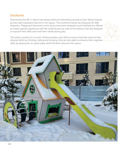 176Discovering the life in nature has always been an interesting concept to kids. Being inspired by fairy tale characters that live in the nature, The Gnohome Series are designed for little dreamers. Playground elements in this series have been designed such that kids are offered an indoor games experience with the small houses as well as the stations that are designed to improve their skills and meet their needs during play. The series consists of a tunnel, climbing station and slide to ensure that kids improve their physical skills by climbing, sliding and jumping. Kids are also able to enhance their cognitive skills by playing the on-panel plays which let them discover the nature.Gnohome