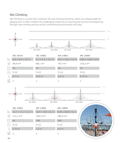 182Net Climbing is a series that combines 3D rope climbing elements, which are indispensable for playgrounds. It offers children the challenging excitement of reaching the top from the beginning through rope climbing activity and by combining physical activity with play.Net Climbing10 m10 m5 m5 m6,8 x 6,8 x 2,9 m13,7 x 13,7 x 6,1 m9,2 x 9,2 x 3,6 m18,4 x 18,4 x 8,1 m 20,45 x 20,45 x 9,1 m10,6 x 10,6 x 4,4 m 13,65 x 13,65 x 4,9 m49,0 m%u00b2111,1 m%u00b268,1 m%u00b2164,5 m%u00b2 184,4 m%u00b279,7 m%u00b2 110,3 m%u00b2106227140 18036 425-125-125-125-12 5-125-12 5-120,7 m10,75 m10,55 m11,6 m10,9 m10,6 m10,75 m1SG 1019SG 1003SG 1019SG 1005SG 1002 SG 1001 SG 1004SG 1003 SG 1006SG 1002SG 1005 SG 1006SG 1001 SG 1004