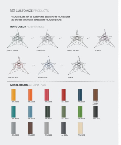 190PURPLERAL 1003 RAL 2008 RAL 3018 RAL 3020 RAL 5001 core ten xy355fRAL 5018RAL 7040RAL 5024RAL 8011RAL 6009RAL 9006RAL 6011sw 306g RAL 1015RAL 6018 RAL 7021BLACKCUSTOMIZE PRODUCTSROPE COLOR ALTERNATIVESMETAL COLOR ALTERNATIVES* Our products can be customized according to your request; you choose the details, personalize your playground.FOREST GREEN STEEL GRAY SANDY BROWNSTRONG RED ROYAL BLUE