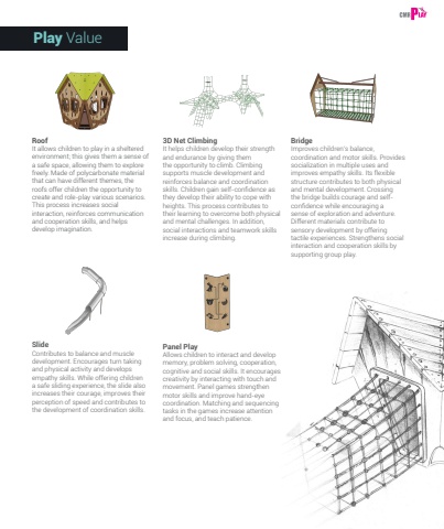225Play ValueRoofIt allows children to play in a sheltered environment; this gives them a sense of a safe space, allowing them to explore freely. Made of polycarbonate material that can have different themes, the roofs offer children the opportunity to create and role-play various scenarios. This process increases social interaction, reinforces communication and cooperation skills, and helps develop imagination.3D Net ClimbingIt helps children develop their strength and endurance by giving them the opportunity to climb. Climbing supports muscle development and reinforces balance and coordination skills. Children gain self-confidence as they develop their ability to cope with heights. This process contributes to their learning to overcome both physical and mental challenges. In addition, social interactions and teamwork skills increase during climbing.SlideContributes to balance and muscle development. Encourages turn taking and physical activity and develops empathy skills. While offering children a safe sliding experience, the slide also increases their courage, improves their perception of speed and contributes to the development of coordination skills.Panel PlayAllows children to interact and develop memory, problem solving, cooperation, cognitive and social skills. It encourages creativity by interacting with touch and movement. Panel games strengthen motor skills and improve hand-eye coordination. Matching and sequencing tasks in the games increase attention and focus, and teach patience.BridgeImproves children%u2019s balance, coordination and motor skills. Provides socialization in multiple uses and improves empathy skills. Its flexible structure contributes to both physical and mental development. Crossing the bridge builds courage and selfconfidence while encouraging a sense of exploration and adventure. Different materials contribute to sensory development by offering tactile experiences. Strengthens social interaction and cooperation skills by supporting group play.