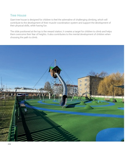 226Giant tree house is designed for children to feel the adrenaline of challenging climbing, which will contribute to the development of their muscle-coordination system and support the development of their physical skills, while having fun. The slide positioned at the top is the reward station; It creates a target for children to climb and helps them overcome their fear of heights. It also contributes to the mental development of children when choosing the path to climb.Tree House