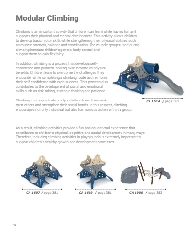 24Climbing is an important activity that children can learn while having fun and supports their physical and mental development. This activity allows children to develop basic motor skills while strengthening their physical abilities such as muscle strength, balance and coordination. The muscle groups used during climbing increase children%u2019s general body control and support them to gain flexibility.In addition, climbing is a process that develops selfconfidence and problem-solving skills beyond its physical benefits. Children learn to overcome the challenges they encounter while completing a climbing route and reinforce their self-confidence with each success. This process also contributes to the development of social and emotional skills such as risk-taking, strategic thinking and patience.Climbing in group activities helps children learn teamwork, trust others and strengthen their social bonds. In this respect, climbing encourages not only individual but also harmonious action within a group.As a result, climbing activities provide a fun and educational experience that contributes to children%u2019s physical, cognitive and social development in many ways. Therefore, including climbing activities in playgrounds is extremely important to support children%u2019s healthy growth and development processes.CA 1607 / page 381 CA 1609 / page 381 CA 1900 / page 382Modular ClimbingCA 1614 / page 381