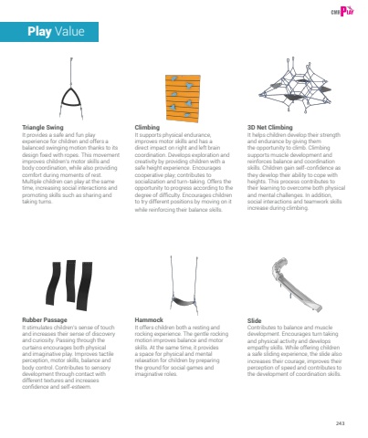 243Play ValueTriangle SwingIt provides a safe and fun play experience for children and offers a balanced swinging motion thanks to its design fixed with ropes. This movement improves children%u2019s motor skills and body coordination, while also providing comfort during moments of rest. Multiple children can play at the same time, increasing social interactions and promoting skills such as sharing and taking turns.3D Net ClimbingIt helps children develop their strength and endurance by giving them the opportunity to climb. Climbing supports muscle development and reinforces balance and coordination skills. Children gain self-confidence as they develop their ability to cope with heights. This process contributes to their learning to overcome both physical and mental challenges. In addition, social interactions and teamwork skills increase during climbing.ClimbingIt supports physical endurance, improves motor skills and has a direct impact on right and left brain coordination. Develops exploration and creativity by providing children with a safe height experience. Encourages cooperative play; contributes to socialization and turn-taking. Offers the opportunity to progress according to the degree of difficulty. Encourages children to try different positions by moving on it while reinforcing their balance skills. SlideContributes to balance and muscle development. Encourages turn taking and physical activity and develops empathy skills. While offering children a safe sliding experience, the slide also increases their courage, improves their perception of speed and contributes to the development of coordination skills.Rubber PassageIt stimulates children%u2019s sense of touch and increases their sense of discovery and curiosity. Passing through the curtains encourages both physical and imaginative play. Improves tactile perception, motor skills, balance and body control. Contributes to sensory development through contact with different textures and increases confidence and self-esteem.HammockIt offers children both a resting and rocking experience. The gentle rocking motion improves balance and motor skills. At the same time, it provides a space for physical and mental relaxation for children by preparing the ground for social games and imaginative roles.