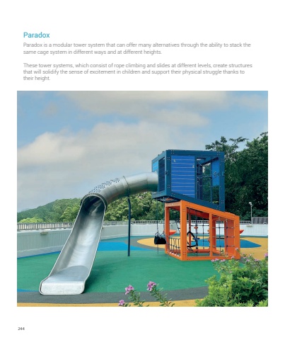 244Paradox is a modular tower system that can offer many alternatives through the ability to stack the same cage system in different ways and at different heights. These tower systems, which consist of rope climbing and slides at different levels, create structures that will solidify the sense of excitement in children and support their physical struggle thanks to their height.Paradox
