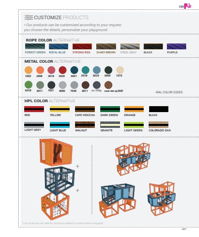 247CUSTOMIZE PRODUCTSMETAL COLOR ALTERNATIVEHPL COLOR ALTERNATIVE1003*RAL COLOR CODES2008 3018 3020 5001 50187021502490066009 10156018 6011 7040 8011 sw 306g core ten xy355fROPE COLOR ALTERNATIVEFOREST GREEN ROYAL BLUE STRONG RED SANDY BROWN STEEL GRAY BLACK PURPLERED ORANGE BLACKWALNUT GRANITEYELLOW CAFE MOCCHA DARK GREENLIGHT GREY LIGHT BLUE LIGHT GREEN COLORADO OAK* Our products can be customized according to your request; you choose the details, personalize your playground.++*List prices are not valid for products related to customization requests.