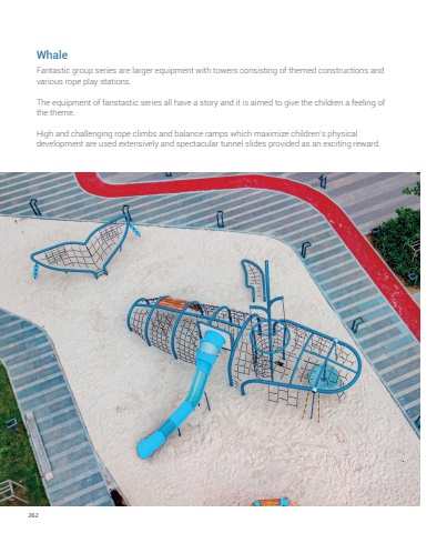 262Fantastic group series are larger equipment with towers consisting of themed constructions and various rope play stations. The equipment of fanstastic series all have a story and it is aimed to give the children a feeling of the theme.High and challenging rope climbs and balance ramps which maximize children%u2019s physical development are used extensively and spectacular tunnel slides provided as an exciting reward.Whale