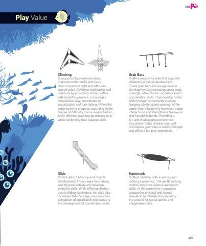 269Play ValueHammockIt offers children both a resting and rocking experience. The gentle rocking motion improves balance and motor skills. At the same time, it provides a space for physical and mental relaxation for children by preparing the ground for social games and imaginative roles.Grab BarsIt offers an activity area that supports children%u2019s physical development. These grab bars encourage muscle development by increasing upper body strength, while reinforcing balance and coordination skills. They develop motor skills through movements such as hanging, climbing and passing. At the same time, this activity increases social interactions and strengthens teamwork and friendship bonds. Providing a fun and challenging environment, this station helps children gain selfconfidence, promotes a healthy lifestyle and offers a fun play experience.ClimbingIt supports physical endurance, improves motor skills and has a direct impact on right and left brain coordination. Develops exploration and creativity by providing children with a safe height experience. Encourages cooperative play; contributes to socialization and turn-taking. Offers the opportunity to progress according to the degree of difficulty. Encourages children to try different positions by moving on it while reinforcing their balance skills.SlideContributes to balance and muscle development. Encourages turn taking and physical activity and develops empathy skills. While offering children a safe sliding experience, the slide also increases their courage, improves their perception of speed and contributes to the development of coordination skills.