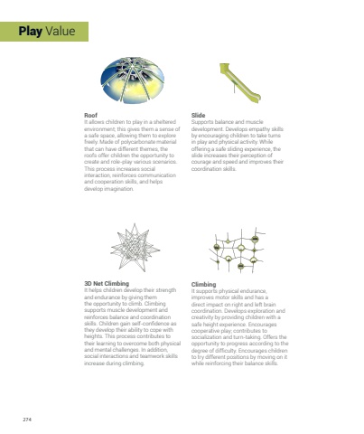 2743D Net ClimbingIt helps children develop their strength and endurance by giving them the opportunity to climb. Climbing supports muscle development and reinforces balance and coordination skills. Children gain self-confidence as they develop their ability to cope with heights. This process contributes to their learning to overcome both physical and mental challenges. In addition, social interactions and teamwork skills increase during climbing.SlideSupports balance and muscle development. Develops empathy skills by encouraging children to take turns in play and physical activity. While offering a safe sliding experience, the slide increases their perception of courage and speed and improves their coordination skills.RoofIt allows children to play in a sheltered environment; this gives them a sense of a safe space, allowing them to explore freely. Made of polycarbonate material that can have different themes, the roofs offer children the opportunity to create and role-play various scenarios. This process increases social interaction, reinforces communication and cooperation skills, and helps develop imagination.Play ValueClimbingIt supports physical endurance, improves motor skills and has a direct impact on right and left brain coordination. Develops exploration and creativity by providing children with a safe height experience. Encourages cooperative play; contributes to socialization and turn-taking. Offers the opportunity to progress according to the degree of difficulty. Encourages children to try different positions by moving on it while reinforcing their balance skills.