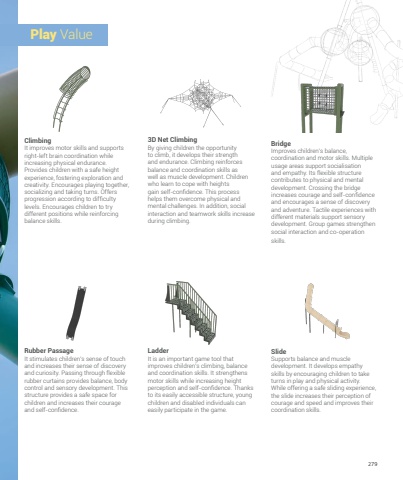 279ClimbingIt improves motor skills and supports right-left brain coordination while increasing physical endurance. Provides children with a safe height experience, fostering exploration and creativity. Encourages playing together, socializing and taking turns. Offers progression according to difficulty levels. Encourages children to try different positions while reinforcing balance skills.3D Net ClimbingBy giving children the opportunity to climb, it develops their strength and endurance. Climbing reinforces balance and coordination skills as well as muscle development. Children who learn to cope with heights gain self-confidence. This process helps them overcome physical and mental challenges. In addition, social interaction and teamwork skills increase during climbing.BridgeImproves children%u2019s balance, coordination and motor skills. Multiple usage areas support socialisation and empathy. Its flexible structure contributes to physical and mental development. Crossing the bridge increases courage and self-confidence and encourages a sense of discovery and adventure. Tactile experiences with different materials support sensory development. Group games strengthen social interaction and co-operation skills.SlideSupports balance and muscle development. It develops empathy skills by encouraging children to take turns in play and physical activity. While offering a safe sliding experience, the slide increases their perception of courage and speed and improves their coordination skills.Rubber PassageIt stimulates children%u2019s sense of touch and increases their sense of discovery and curiosity. Passing through flexible rubber curtains provides balance, body control and sensory development. This structure provides a safe space for children and increases their courage and self-confidence.LadderIt is an important game tool that improves children%u2019s climbing, balance and coordination skills. It strengthens motor skills while increasing height perception and self-confidence. Thanks to its easily accessible structure, young children and disabled individuals can easily participate in the game.Play Value