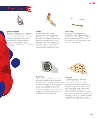 291Melody RhythmDevelops children%u2019s rhythm, auditory awareness and hand-eye coordination. Exploring different sounds encourages creativity and musical skills while strengthening children%u2019s sense of rhythm. It also increases social interaction and cooperation by enabling group play.SlidesIt helps balance and muscle development. It also encourages participation in play and physical activity and develops empathy skills. By offering children a safe sliding experience, the slide increases their courage, improves their perception of speed and contributes to the development of coordination skills.Panel PlayAllows children to interact and develop memory, problem solving, cooperation, cognitive and social skills. It encourages creativity by interacting with touch and movement. Panel games strengthen motor skills and improve hand-eye coordination. Matching and sequencing tasks in the games increase attention and focus, and teach patience. ClimbingIt supports physical endurance, improves motor skills and has a direct impact on right and left brain coordination. Develops exploration and creativity by providing children with a safe height experience. Encourages cooperative play; contributes to socialization and turn-taking. Offers the opportunity to progress according to the degree of difficulty. Encourages children to try different positions by moving on it while reinforcing their balance skills. Hemp RopeImproves children%u2019s balance and coordination skills. Children strive to maintain balance by stepping carefully, which strengthens their motor skills and boosts their self-confidence. Offers children a fun challenge.Play Value