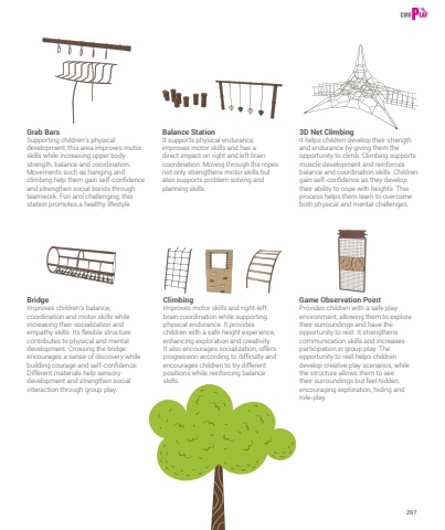 297BridgeImproves children%u2019s balance, coordination and motor skills while increasing their socialization and empathy skills. Its flexible structure contributes to physical and mental development. Crossing the bridge encourages a sense of discovery while building courage and self-confidence. Different materials help sensory development and strengthen social interaction through group play.Game Observation PointProvides children with a safe play environment, allowing them to explore their surroundings and have the opportunity to rest. It strengthens communication skills and increases participation in group play. The opportunity to rest helps children develop creative play scenarios, while the structure allows them to see their surroundings but feel hidden, encouraging exploration, hiding and role-play.3D Net ClimbingIt helps children develop their strength and endurance by giving them the opportunity to climb. Climbing supports muscle development and reinforces balance and coordination skills. Children gain self-confidence as they develop their ability to cope with heights. This process helps them learn to overcome both physical and mental challenges.Grab BarsSupporting children%u2019s physical development, this area improves motor skills while increasing upper body strength, balance and coordination. Movements such as hanging and climbing help them gain self-confidence and strengthen social bonds through teamwork. Fun and challenging, this station promotes a healthy lifestyle.ClimbingImproves motor skills and right-left brain coordination while supporting physical endurance. It provides children with a safe height experience, enhancing exploration and creativity. It also encourages socialization, offers progression according to difficulty and encourages children to try different positions while reinforcing balance skills.Balance StationIt supports physical endurance, improves motor skills and has a direct impact on right and left brain coordination. Moving through the ropes not only strengthens motor skills but also supports problem solving and planning skills.