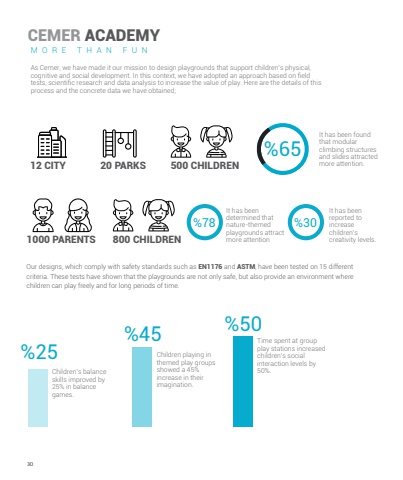 30CEMER ACADEMYMORE THAN FUNAs Cemer, we have made it our mission to design playgrounds that support children%u2019s physical, cognitive and social development. In this context, we have adopted an approach based on field tests, scientific research and data analysis to increase the value of play. Here are the details of this process and the concrete data we have obtained;12 CITY 20 PARKS 500 CHILDREN1000 PARENTS 800 CHILDREN%78 %30It has been found that modular climbing structures and slides attracted more attention.It has been determined that nature-themed playgrounds attract more attentionIt has been reported to increase children%u2019s creativity levels.%65%25%50 %45Our designs, which comply with safety standards such as EN1176 and ASTM, have been tested on 15 different criteria. These tests have shown that the playgrounds are not only safe, but also provide an environment where children can play freely and for long periods of time.Time spent at group play stations increased children%u2019s social interaction levels by 50%.Children playing in themed play groups showed a 45% increase in their imagination.Children%u2019s balance skills improved by 25% in balance games.
