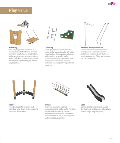 319TableProvides space for multiple and individual play. It can be a socializing point or a rest station. SlideContributes to balance and muscle development. Encourages taking turns and develops empathy skills.Play ValueFireman Pole / BannisterSupports body coordination while sliding down, exercises arm and abdominal muscles. Contributes to bone development. They learn to take risks and take turns.Role PlayRole-playing games designed in accordance with the theme develop children%u2019s creativity and imagination, and strengthen their problem-solving and social skills. It contributes to their socialization by encouraging them to play together. BridgeImproves children%u2019s balance, coordination and motor skills. Provides socialization in multiple uses and improves empathy skills. Its flexible structure contributes to both physical and mental development. ClimbingDevelops physical endurance and motor skills, supports right-left brain coordination. Encourages exploration and creativity at a safe height. Offers socialization, turn taking and progression. Reinforces balance skills and encourages trying different positions.