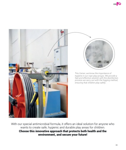 33With our special antimicrobial formula, it offers an ideal solution for anyone who wants to create safe, hygienic and durable play areas for children.Choose this innovative approach that protects both health and the environment, and secure your future!*As Cemer, we know the importance of hygiene in our rope play groups. We provide a fast and effective solution with the disinfection process we carry out with the fogging method, ensuring that children play safely.