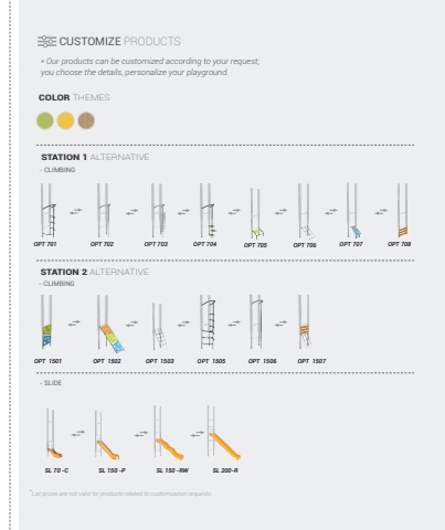 335OPT 701 OPT 702 OPT 703 OPT 704 OPT 705 OPT 706 OPT 707 OPT 708OPT 1501SL 70 -COPT 1503SL 150 -RWOPT 1502 OPT 1506SL 150 -POPT 1505SL 200-ROPT 1507CUSTOMIZE PRODUCTSCOLOR THEMESSTATION 1 ALTERNATIVESTATION 2 ALTERNATIVE* Our products can be customized according to your request; you choose the details, personalize your playground.- CLIMBING- CLIMBING- SLIDE*List prices are not valid for products related to customization requests.