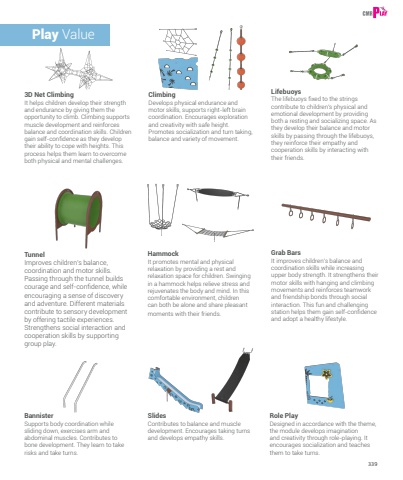 339Play Value3D Net ClimbingIt helps children develop their strength and endurance by giving them the opportunity to climb. Climbing supports muscle development and reinforces balance and coordination skills. Children gain self-confidence as they develop their ability to cope with heights. This process helps them learn to overcome both physical and mental challenges.LifebuoysThe lifebuoys fixed to the strings contribute to children%u2019s physical and emotional development by providing both a resting and socializing space. As they develop their balance and motor skills by passing through the lifebuoys, they reinforce their empathy and cooperation skills by interacting with their friends.ClimbingDevelops physical endurance and motor skills, supports right-left brain coordination. Encourages exploration and creativity with safe height. Promotes socialization and turn taking, balance and variety of movement.Hammock It promotes mental and physical relaxation by providing a rest and relaxation space for children. Swinging in a hammock helps relieve stress and rejuvenates the body and mind. In this comfortable environment, children can both be alone and share pleasant moments with their friends.TunnelImproves children%u2019s balance, coordination and motor skills. Passing through the tunnel builds courage and self-confidence, while encouraging a sense of discovery and adventure. Different materials contribute to sensory development by offering tactile experiences. Strengthens social interaction and cooperation skills by supporting group play.SlidesContributes to balance and muscle development. Encourages taking turns and develops empathy skills.BannisterSupports body coordination while sliding down, exercises arm and abdominal muscles. Contributes to bone development. They learn to take risks and take turns.Grab BarsIt improves children%u2019s balance and coordination skills while increasing upper body strength. It strengthens their motor skills with hanging and climbing movements and reinforces teamwork and friendship bonds through social interaction. This fun and challenging station helps them gain self-confidence and adopt a healthy lifestyle.Role PlayDesigned in accordance with the theme, the module develops imagination and creativity through role-playing. It encourages socialization and teaches them to take turns.