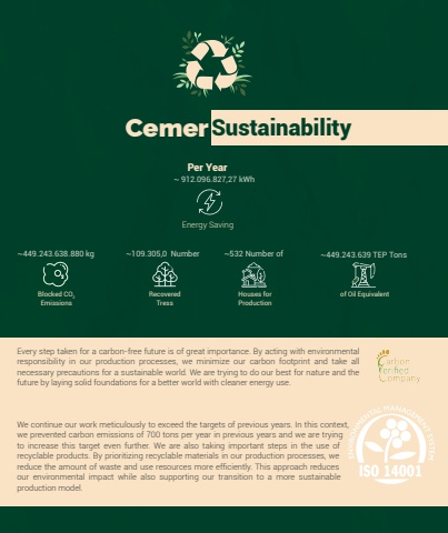 34Every step taken for a carbon-free future is of great importance. By acting with environmental responsibility in our production processes, we minimize our carbon footprint and take all necessary precautions for a sustainable world. We are trying to do our best for nature and the future by laying solid foundations for a better world with cleaner energy use. We continue our work meticulously to exceed the targets of previous years. In this context, we prevented carbon emissions of 700 tons per year in previous years and we are trying to increase this target even further. We are also taking important steps in the use of recyclable products. By prioritizing recyclable materials in our production processes, we reduce the amount of waste and use resources more efficiently. This approach reduces our environmental impact while also supporting our transition to a more sustainable production model.Cemer~ 912.096.827,27 kWh~449.243.638.880 kg ~109.305,0 Number ~532 Number of ~449.243.639 TEP TonsSustainabilityPer YearEnergy SavingBlocked CO2EmissionsRecoveredTressHouses forProductionof Oil Equivalent