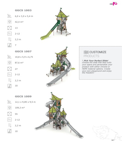 3476,0 x 3,0 x 5,4 m42,4 m%u00b2132-122,3 m7GGCS 100310,8 x 5,9 x 6,75 m12,1 x 9,85 x 9,5 m87,6 m%u00b2109,3 m%u00b227552-122-122,3 m102,2 m10GGCS 1007GGCS 1009* Pick Your Perfect Slide!Choose the slide that best suits your space and personalize your product with either chrome or HDPE material options. Create your own playground and enjoy the freedom! CUSTOMIZEPRODUCTS