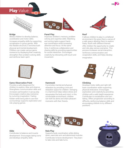 349Role PlaySupports body coordination while sliding down, exercises arm and abdominal muscles. Contributes to bone development. They learn to take risks and take turns.Panel Play Improves children%u2019s memory, problem solving and cognitive skills. Matching and sorting tasks support handeye coordination while increasing attention and focus. At the same time, it reinforces collaboration and sharing skills by providing opportunities for social interaction. Encourages creativity by interacting with touch and movement.BridgeAllows children to develop balance, coordination and motor skills. Increases empathy skills by supporting socialization in group games. With this flexible structure, it enriches both physical and mental development. Children can create various game scenarios by displaying their creativity, strengthen their problem solving skills and reinforce team spirit.SlideContributes to balance and muscle development. Encourages taking turns and develops empathy skills.Play ValueGame Observation PointProvides a safe playground for children to explore, relax and observe. Strengthens communication skills and increases participation in group play. Encourages creative play scenarios by nurturing imagination. Feeling hidden while being able to see their surroundings supports exploration and role-playing games.ClimbingDevelops motor skills and right-left brain coordination while supporting physical endurance. Encourages exploration and creativity by providing children with a safe height experience. Contributes to socialization and turn taking. Offers progression according to difficulty, reinforcing balance skills and encouraging children to try different positions.RoofIt allows children to play in a sheltered environment; this gives them a sense of a safe space, allowing them to explore freely. Roofs with different themes offer children the opportunity to create and role-play various scenarios. This process increases social interaction, reinforces communication and cooperation skills, and helps develop imagination. HammockIt promotes mental and physical relaxation by providing a rest and relaxation space for children. Swinging in a hammock helps relieve stress and rejuvenates the body and mind. In this comfortable environment, children can both be alone and share pleasant moments with their friends.