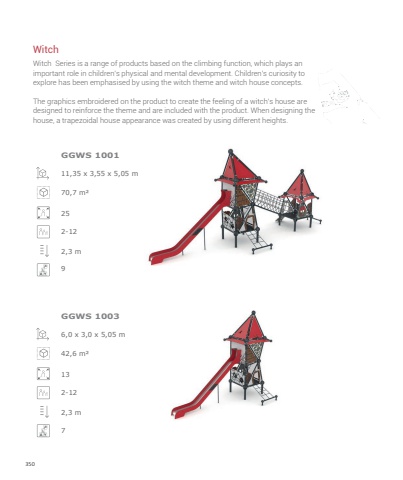 350Witch Series is a range of products based on the climbing function, which plays an important role in children%u2019s physical and mental development. Children%u2019s curiosity to explore has been emphasised by using the witch theme and witch house concepts.The graphics embroidered on the product to create the feeling of a witch%u2019s house are designed to reinforce the theme and are included with the product. When designing the house, a trapezoidal house appearance was created by using different heights.11,35 x 3,55 x 5,05 m6,0 x 3,0 x 5,05 m70,7 m%u00b242,6 m%u00b225132-122-122,3 m92,3 m7WitchGGWS 1001GGWS 1003