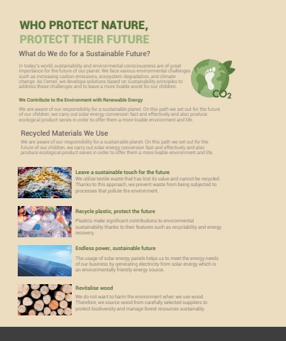 36WHO PROTECT NATURE, PROTECT THEIR FUTUREIn today%u2019s world, sustainability and environmental consciousness are of great importance for the future of our planet. We face various environmental challenges such as increasing carbon emissions, ecosystem degradation, and climate change. As Cemer, we develope solutions based on sustainability principles to address these challenges and to leave a more livable world for our children.We are aware of our responsibility for a sustainable planet. On this path we set out for the future of our children, we carry out solar energy conversion fast and effectively and also produce ecological product series in order to offer them a more livable environment and life.We are aware of our responsibility for a sustainable planet. On this path we set out for the future of our children, we carry out solar energy conversion fast and effectively and also produce ecological product series in order to offer them a more livable environment and life.What do We do for a Sustainable Future?Recycled Materials We UseWe Contribute to the Environment with Renewable EnergyLeave a sustainable touch for the futureRecycle plastic, protect the futureWe utilise textile waste that has lost its value and cannot be recycled. Thanks to this approach, we prevent waste from being subjected to processes that pollute the environment.Plastics make significant contributions to environmental sustainability thanks to their features such as recyclability and energy recovery.Endless power, sustainable futureThe usage of solar energy panels helps us to meet the energy needs of our business by generating electricity from solar energy which is an environmentally friendly energy source.Revitalise woodWe do not want to harm the environment when we use wood. Therefore, we source wood from carefully selected suppliers to protect biodiversity and manage forest resources sustainably.
