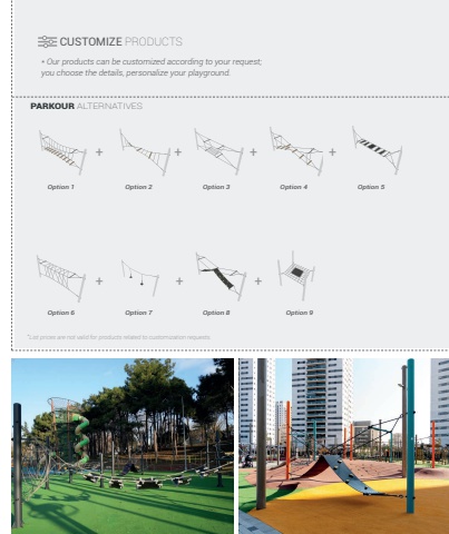 367PARKOUR ALTERNATIVESOption 1Option 6Option 2Option 7Option 3Option 8Option 4Option 9Option 5++ + ++ + +CUSTOMIZE PRODUCTS* Our products can be customized according to your request; you choose the details, personalize your playground.*List prices are not valid for products related to customization requests.