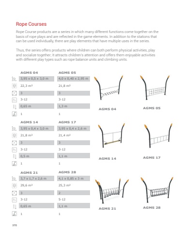 3703,95 x 0,5 x 3,0 m3,95 x 0,4 x 3,0 m3,7 x 1,7 x 2,6 m4,0 x 0,40 x 2,95 m3,95 x 0,4 x 2,6 m4,1 x 0,85 x 3 m22,3 m%u00b221,8 m%u00b229,6 m%u00b221,8 m%u00b221,4 m%u00b225,3 m%u00b23333323-123-123-123-123-125-120,65 m1110,5 m0,65 m1,3 m1111,1 m1,1 mAGMS 04AGMS 14AGMS 21AGMS 04AGMS 14AGMS 21AGMS 05AGMS 17AGMS 28AGMS 05AGMS 17AGMS 28Rope Course products are a series in which many different functions come together on the basis of rope plays and are reflected in the game elements. In addition to the stations that can be used individually, there are play elements that have multiple uses in the series. Thus, the series offers products where children can both perform physical activities, play and socialize together; It attracts children%u2019s attention and offers them enjoyable activities with different play types such as rope balance units and climbing units.Rope Courses