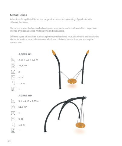 372Adventure Group Metal Series is a range of accessories consisting of products with different functions. The series feature both individual and group accessories which allow children to perform intense physical activities while playing and socialising. Different types of activities such as spinning mechanisms, mutual swinging and oscillating elements, various rope balance units which are children%u2019s top choices, are among the accessories.Metal Series3,15 x 0,8 x 3,1 m5,1 x 4,15 x 2,95 m23,8 m%u00b261,6 m%u00b2225-125-121,3 m11,8 m1 AGMS 01AGMS 09
