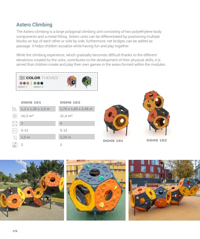 378The Astero climbing is a large polygonal climbing unit consisting of two polyethylene body components and a metal fitting. Astero units can be differentiated by positioning multiple blocks on top of each other or side by side, furthermore, net bridges can be added as passage. It helps children socialize while having fun and play together. While the climbing experience, which gradually becomes difficult thanks to the different elevations created by the units, contributes to the development of their physical skills, it is aimed that children create and play their own games in the areas formed within the modules.Astero ClimbingCOLOR THEMES1,2 x 1,35 x 1,5 m 1,75 x 1,65 x 2,45 m14,3 m%u00b2 21,4 m%u00b22 45-12 5-121,5 m22,25 m2DGHS 101DGHS 101DGHS 102DGHS 102option 1 opt%u0131on 2