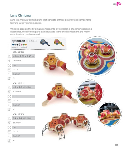 387COLOR THEMESLuna is a modular climbing unit that consists of three polyethylene components forming large volume modules. While he gaps on the two main components give children a challenging climbing experience, the different parts can be placed in the third component and many combinations can be created.Luna Climbing4,80 x 2,60 x 2,45 m36,0 m%u00b2103-121,75 m5CA 17004,8 x 4,8 x 2,45 m43,0 m%u00b2113-121,75 m5CA 17019,2 x 8,1 x 2,45 m86,9 m%u00b2343-121,75 m6CA 1713option 1 option 2