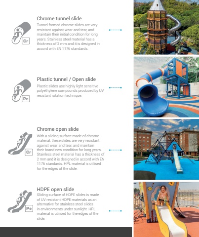 39CrChrome tunnel slidePlastic tunnel / Open slideChrome open slideHDPE open slideTunnel formed chrome slides are very resistant against wear and tear, and maintain their initial condition for long years. Stainless steel material has a thickness of 2 mm and it is designed in accord with EN 1176 standards.Plastic slides use highly light sensitive polyethylene compounds produced by UV resistant rotation technique. With a sliding surface made of chrome material, these slides are very resistant against wear and tear, and maintain their brand new condition for long years. Stainless steel material has a thickness of 2 mm and it is designed in accord with EN 1176 standards. HPL material is utilised for the edges of the slide.Sliding surface of HDPE slides is made of UV resistant HDPE materials as an alternative for stainless steel slides in environments under sunlight. HPL material is utilised for the edges of the slide.PePeCr