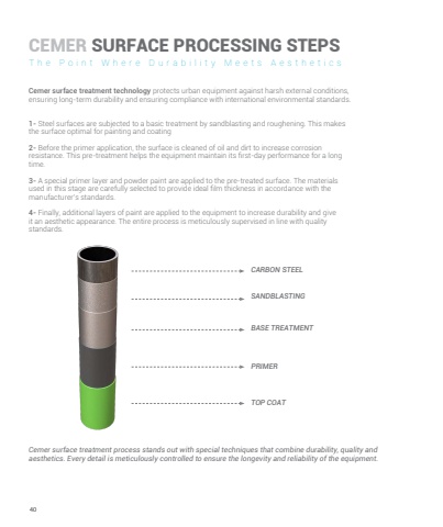40CEMER SURFACE PROCESSING STEPSCemer surface treatment technology protects urban equipment against harsh external conditions, ensuring long-term durability and ensuring compliance with international environmental standards.Cemer surface treatment process stands out with special techniques that combine durability, quality and aesthetics. Every detail is meticulously controlled to ensure the longevity and reliability of the equipment.CARBON STEELSANDBLASTINGBASE TREATMENTPRIMERTOP COAT1- Steel surfaces are subjected to a basic treatment by sandblasting and roughening. This makes the surface optimal for painting and coating2- Before the primer application, the surface is cleaned of oil and dirt to increase corrosion resistance. This pre-treatment helps the equipment maintain its first-day performance for a long time.3- A special primer layer and powder paint are applied to the pre-treated surface. The materials used in this stage are carefully selected to provide ideal film thickness in accordance with the manufacturer%u2019s standards.4- Finally, additional layers of paint are applied to the equipment to increase durability and give it an aesthetic appearance. The entire process is meticulously supervised in line with quality standards.The Point Where Durability Meets Aesthetics