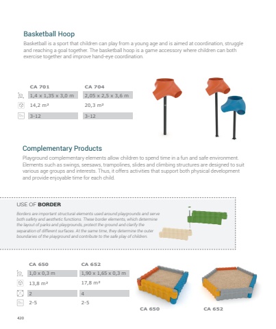 420Playground complementary elements allow children to spend time in a fun and safe environment. Elements such as swings, seesaws, trampolines, slides and climbing structures are designed to suit various age groups and interests. Thus, it offers activities that support both physical development and provide enjoyable time for each child.Complementary ProductsBorders are important structural elements used around playgrounds and serve both safety and aesthetic functions. These border elements, which determine the layout of parks and playgrounds, protect the ground and clarify the separation of different surfaces. At the same time, they determine the outer boundaries of the playground and contribute to the safe play of children.USE OF BORDER1,0 x 0,3 m13,8 m%u00b222-5CA 6501,90 x 1,65 x 0,3 m17,8 m%u00b242-5CA 652Basketball is a sport that children can play from a young age and is aimed at coordination, struggle and reaching a goal together. The basketball hoop is a game accessory where children can both exercise together and improve hand-eye coordination.Basketball Hoop1,4 x 1,35 x 3,0 m14,2 m%u00b23-12CA 7012,05 x 2,5 x 3,6 m20,3 m%u00b23-12CA 704CA 650 CA 652
