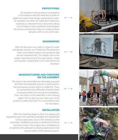 53ENGINEERINGMANUFACTURING AND CHECKING ON THE ASSEMBLYINSTALLATIONPROTOTYPINGAfter the decisions are made in regard to scale and design choices, our Production Development Team turns these projects into products that can be manufactured. This stage%u2019s aim is the proper manufacturing of the rope, plastic, metal and wooden components in our manufacturing structure.The parts to be assembled are delicately prepared and then the assembly process is performed in the prototyping section which is called PR. Thus, we can prevent any difficulties that the client could potentially have during the installation. Then, we check on the assembly in the meeting called TGG so that we can make sure of the product%u2019s safety and that it is in accordance with the standards. After the checking stage is done, the playground equipment parts are carefully packaged and dispatched to the project area. Due to the checking on the assembly, installation process is performed without facing an issue in the project area. Installation is completed with adequate surfacing applications that ensure safety of the special projects.3D samples of the products are prepared in accordance with the sketches in order to determine area%u2019s final design and product%u2019s ratio. 3D samples can either be made from stationery materials or obtained from a 3D printer. Being one of today%u2019s most significant technologies, 3D printers provide the means to create product samples with an accurate scale.