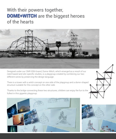 64With their powers together, DOME+WITCH are the biggest heroes of the hearts Designed under our CMR IDEA brand, Dome-Witch, which emerged as a result of our need-based and site-specific studies, is a playgroup created by combining our two different series by preserving the design language. There is a tower with a witch concept on one side of the playgroup and a dome-shaped structure suitable for this concept on the other side. Thanks to the bridge connecting these two structures, children can enjoy the fun to the fullest in this gigantic playgroup.DOME+WITCH