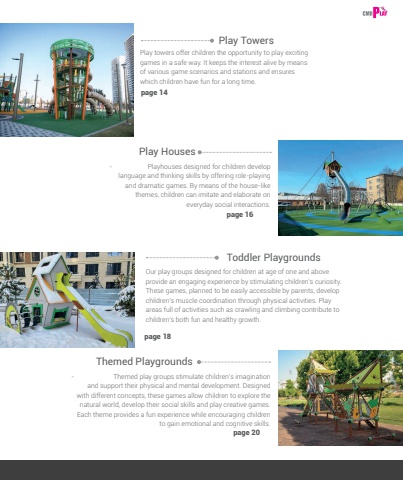 7Play towers offer children the opportunity to play exciting games in a safe way. It keeps the interest alive by means of various game scenarios and stations and ensures which children have fun for a long time.Play Towers- Playhouses designed for children develop language and thinking skills by offering role-playing and dramatic games. By means of the house-like themes, children can imitate and elaborate on everyday social interactions.- Themed play groups stimulate children%u2019s imagination and support their physical and mental development. Designed with different concepts, these games allow children to explore the natural world, develop their social skills and play creative games. Each theme provides a fun experience while encouraging children to gain emotional and cognitive skills.Play HousesThemed PlaygroundsOur play groups designed for children at age of one and above provide an engaging experience by stimulating children%u2019s curiosity. These games, planned to be easily accessible by parents, develop children%u2019s muscle coordination through physical activities. Play areas full of activities such as crawling and climbing contribute to children%u2019s both fun and healthy growth.Toddler Playgroundspage 14page 16page 18page 20