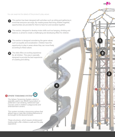 731234You can examine the details of the product%u2019s play valuesThis section has been designed with activities such as sitting and gathering in mind that everyone can enjoy. By creating areas that bring children together, opportunities are provided for them to have fun and socialize together.This section, designed to develop motor skills such as hanging, climbing and balance, is aimed to create a challenging and developing effect for children.The slide offers an exciting experience for all children. This area is specially designed to provide the best experience of crawling and sliding.This section is designed considering the game values such as equality and socialization. Children have the opportunity to play in areas where they can move freely according to these values.1234!!SPHERE TENSIONING SYSTEMThe Sphere Tensioning System, which is specially used in our World Cup product, is preferred in net climbing, netted and rope courses used in children%u2019s playgrounds and entertainment centers.This system includes a tensioning sphere that allows rope or rope-like climbing elements to be brought to the desired tension.These structures, which require climbing and holding tight, offer children a safe and fun play experience.