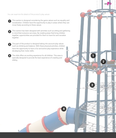 1031This section is designed considering the game values such as equality and socialization. Children have the opportunity to play in areas where they can move freely according to these values.You can examine the details of the product%u2019s play values4The slide offers an exciting experience for all children. This area is specially designed to provide the best experience of crawling and sliding.2This section has been designed with activities such as sitting and gathering in mind that everyone can enjoy. By creating areas that bring children together, opportunities are provided for them to have fun and socialize together.3This part of the product is designed taking into account play values such as climbing and balance. With these physical activities, children have the opportunity to have a fun and active play experience while developing their motor skills.1234