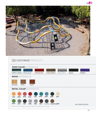 241CUSTOMIZE PRODUCTSWOOD ALTERNATIVEMETAL COLOR ALTERNATIVE1003*RAL RENK KODLARI20083018302050015018702150249006600910156018601170408011sw 306gcore ten xy355flarex pineirokkosapelliROPE COLOR ALTERNATIVEFOREST GREENROYAL BLUESTRONG REDSANDY BROWNSTEEL GRAYBLACKPURPLE*List prices are not valid for products related to customization requests.