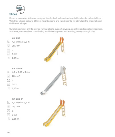 390Cemer%u2019s innovative slides are designed to offer both safe and unforgettable adventures for children! With their vibrant colours, different height options and fun descents, we stimulate the imagination of children of all ages. Our slides aim not only to provide fun but also to support physical, cognitive and social development. As Cemer, we care about contributing to children%u2019s growth and learning journey through play!Slides4,7 x 0,65 x 3,2 m28,7 m%u00b213-122,15 mCA 2534,6 x 0,65 x 3,1 m4,7 x 0,65 x 3,2 m28,4 m%u00b228,7 m%u00b2113-123-122,15 m2,15 mCA 253-CCA 253-P